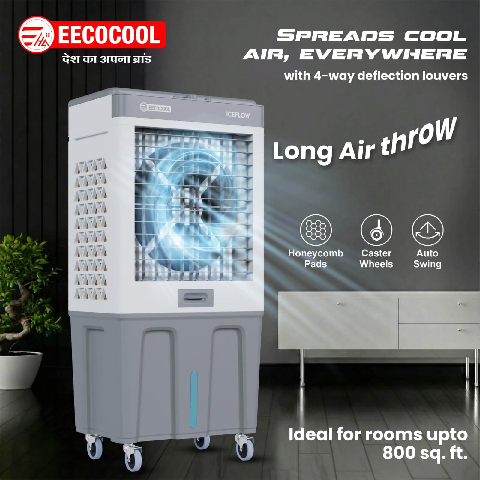 The EECOCOOL Iceflow is a total game-changer. The 120 Ltr tank is massive—I fill it once and forget about it for nearly two days! The cooling is powerful, and the Auto Swing ensures the air reaches every corner of my large hall. Highly impressed with the build quality.